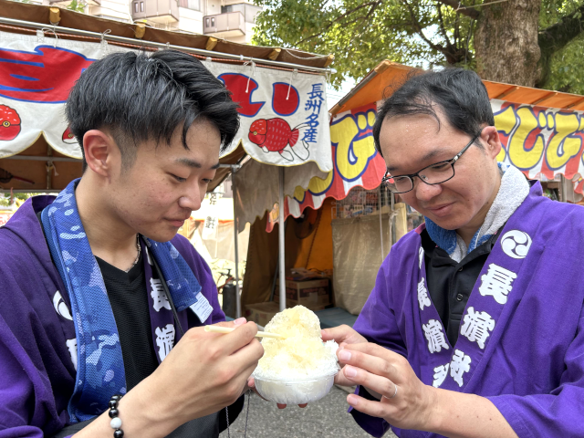 最高気温34度の快晴となった6日、大分営業所の若手などの有志社員は屋台のかき氷や飲み物で水分補給をしたのち、長浜地区の神輿に先立って出発する舞鶴町の山車曳きに参加し、夕方までかけて中島中央町から長浜町を練り歩きました。