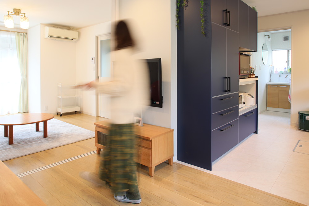 昔ながらの和の雰囲気を一新、白とネイビーで統一したキッチン。フラットなデザインに高い収納力、キッチンには食器洗浄機を内蔵。キッチンリフォームによって、家事ラク&効率的になりました。